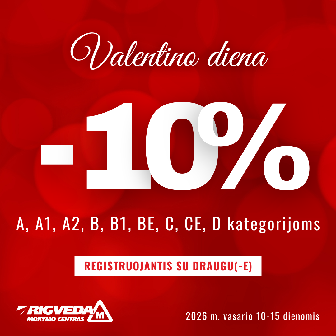 👫 Atvykite dviese į pasirinktą Rigveda mokymo centro filialą, registruokitės į A1, A2, A, B1, B, BE, C, CE arba D kategorijų vairavimo kursus (galite rinktis skirtingas kategorijas) ir kiekvienam pritaikysime -10 % nuolaidą nuo pradinės kursų kainos.