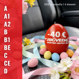 *Pasiūlymas galioja fizinėms ir internetinėms registracijoms į A, A1, A2, B, B1, BE, C, CE, D kategorijų kursus visuose Rigveda mokymo centruose ir registracijoms www.rigveda.lt 2026 m. balandžio 1-6 dienomis.